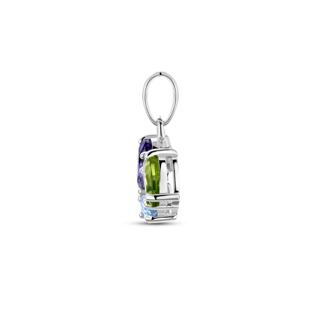 Gerhodineerd 925 zilveren hanger uitgevoerd met vier stenen: zirkonia, zirkonia amethist, synth. blauw spinel en synth. peridot. De hanger hebben een totaal hoogte van 16mm.