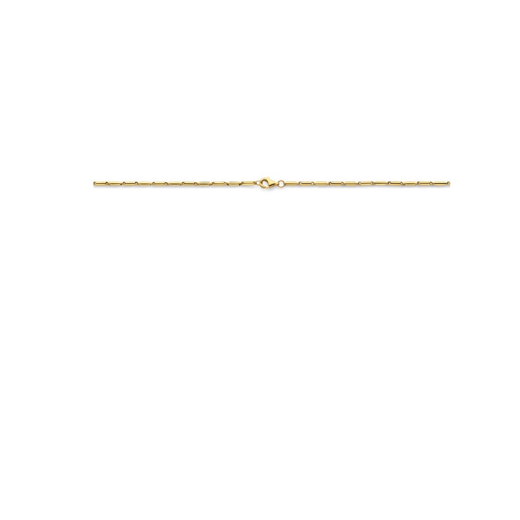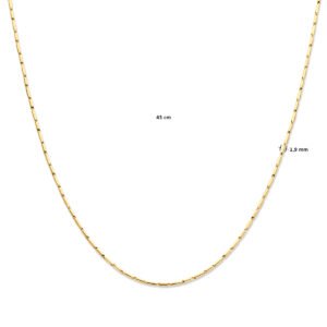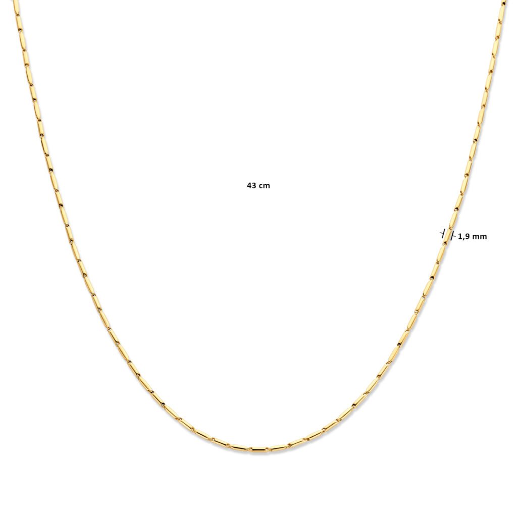 Deze gouden ketting is vervaardigd uit 14 karaat geelgoud en heeft een elegante en subtiele uitstraling. Met een dikte van 1,9 mm en een lengte van 43 cm is dit collier perfect om solo te dragen of te combineren met een hanger. De fijne schakels zorgen voor een mooie glans en een comfortabele pasvorm, terwijl de hoogwaardige afwerking garant staat voor duurzaamheid en een luxe uitstraling.