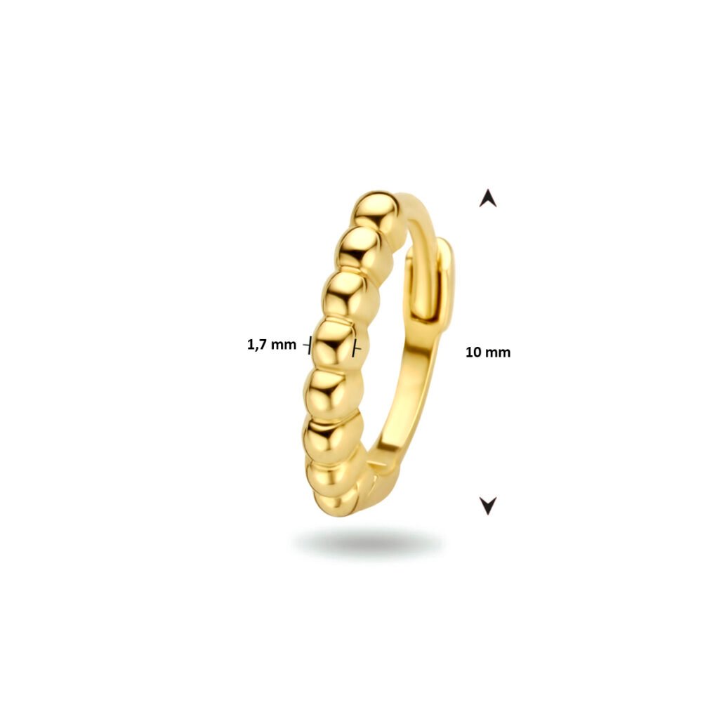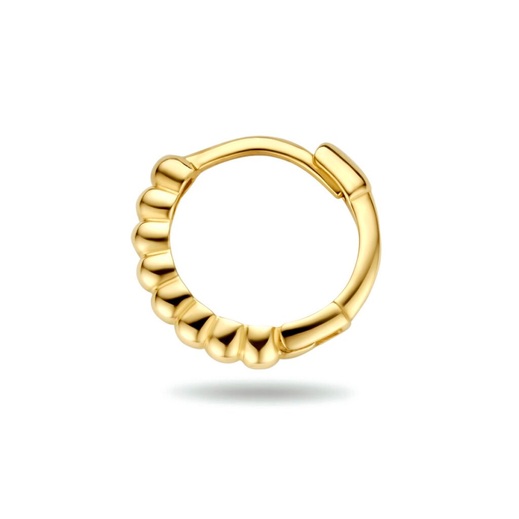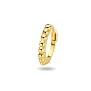14k Geelgouden klapoorring uitgevoerd met bolletjes. De oorring heeft een diameter van 10mm en een dikte van 1.7mm. Deze oorsieraden worden per stuk verkocht ipv per paar.