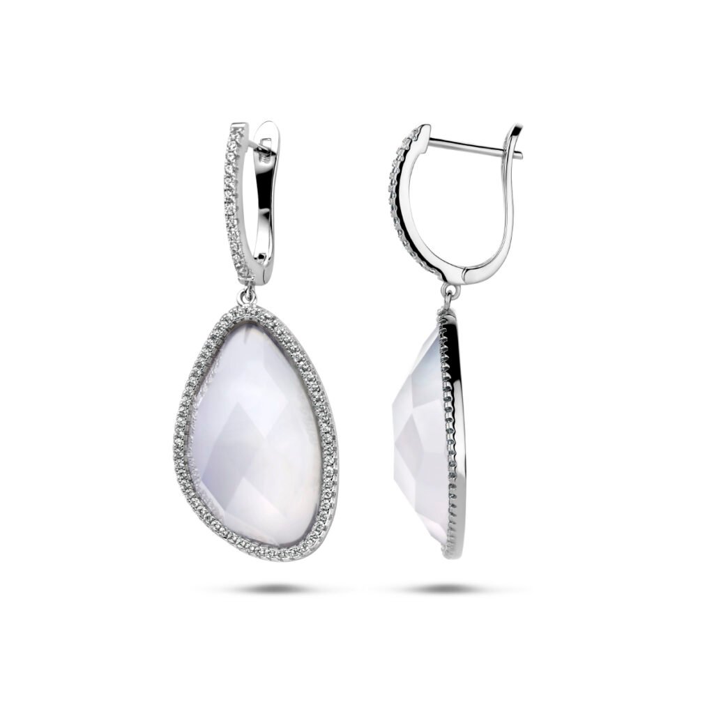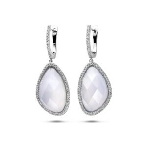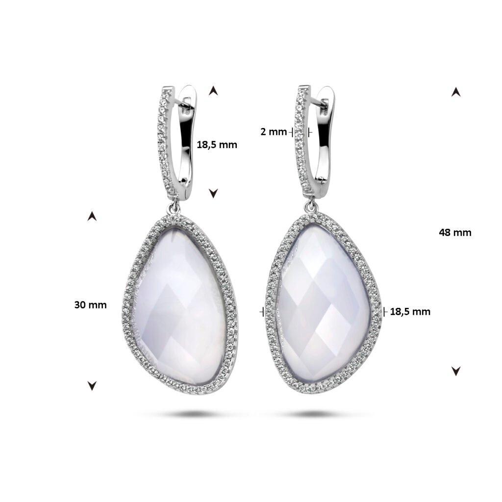 Gerhodineerd 925 zilveren klapoorringen uitgevoerd met chalcedoon en zirkonia. De klapoorringen hebben een totale hoogte van 48mm.