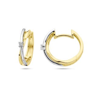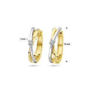 14k Bicolor geel- en witgouden klapoorringen uitgevoerd met diamant. De oorringen hebben een totale hoogte van 14mm.