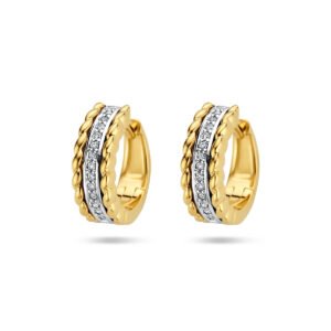 14k Bicolor geel- en witgouden klapoorringen met een diameter van 13mm. Uitgevoerd met een schitterende diamant rij.