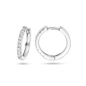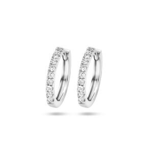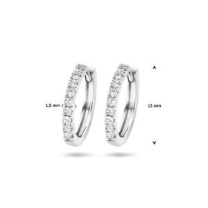 14k Witgouden oorringen met scharnier uitgevoerd met een schitterende diamant rij. De oorringen hebben een afmeting van 12×1.5mm.