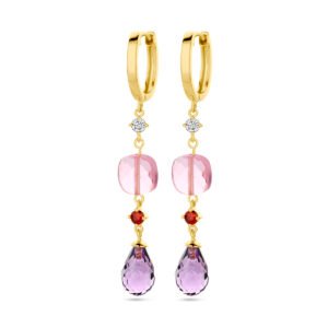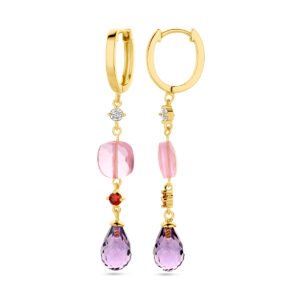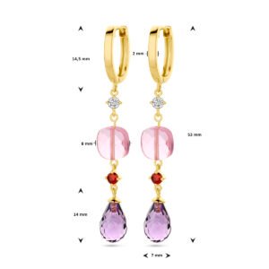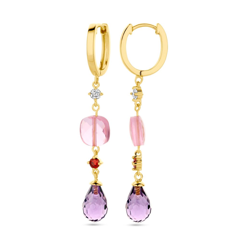 Geelgoud op 925 zilveren klapoorringen met een totale hoogte van 53mm. De oorringen zijn uitgevoerd met wit en granaat zirkonia.