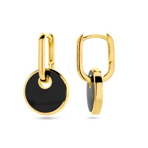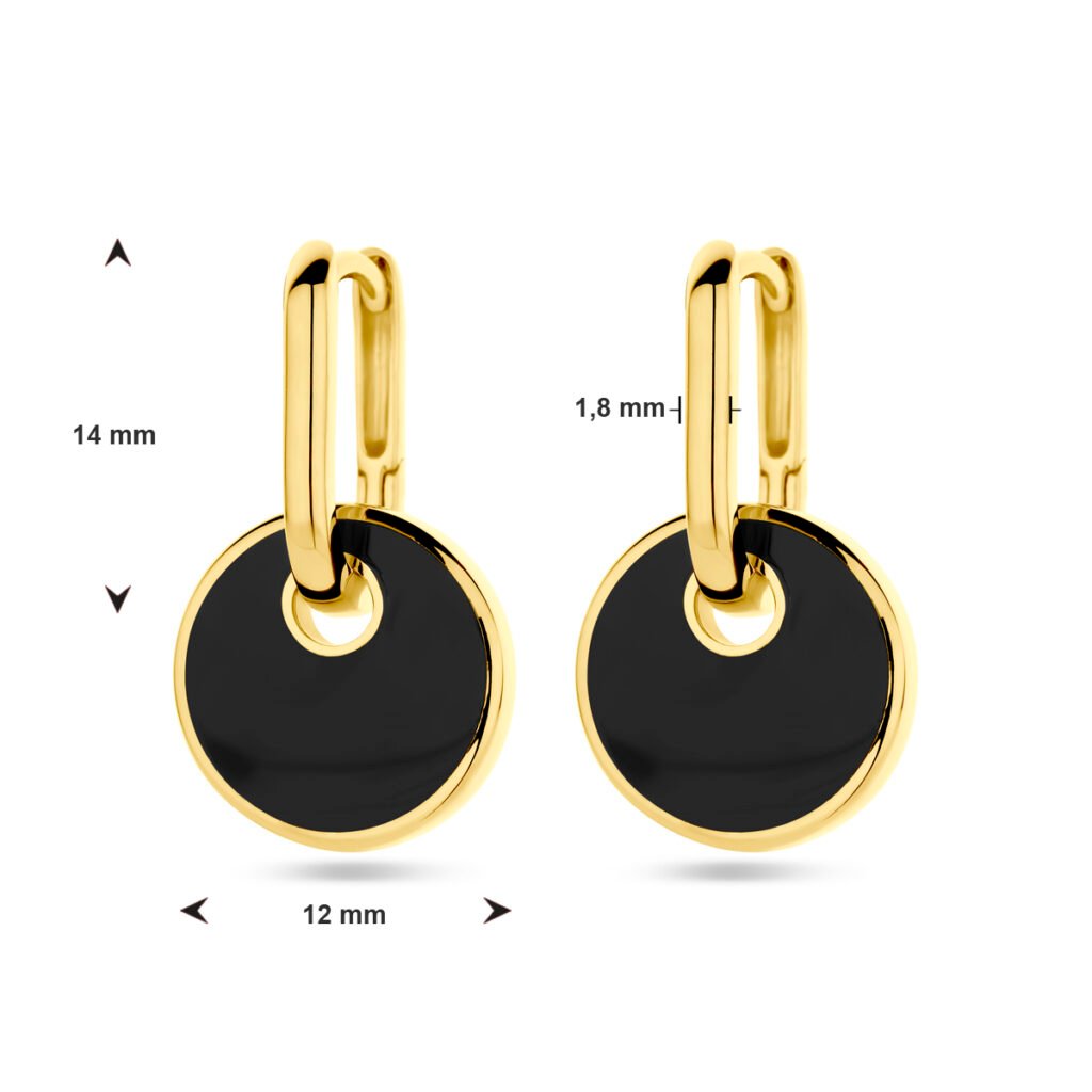 Geelgoud op zilveren klapoorringen uitgevoerd met onyx. De oorringen hebben een afmeting van 14×1.8mm.