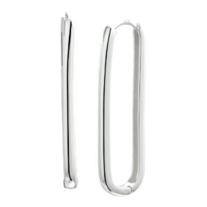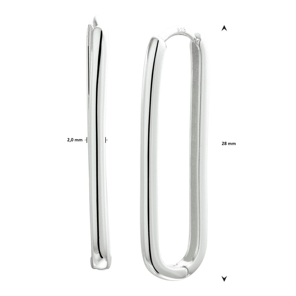 Deze klapoorringen zijn gemaakt van 925 sterling zilver, de allerbeste kwaliteit zilver, met een fijntjes gepolijst oppervlak dat mooi glanst en een laagje rhodium waardoor die glans extra lang behouden blijft. De langwerpige oorringen bestaan uit een egale strook zilver die bol staat en ze worden gesloten door middel van een scharnier. Het sieraad heeft een afmeting van 28 mm x 2 mm.