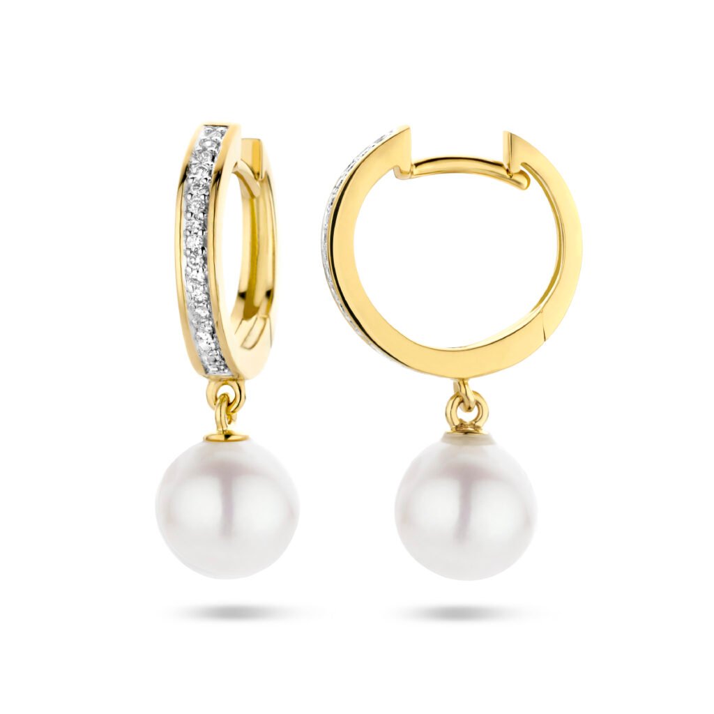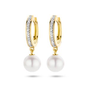 14k Geelgouden klapoorringen uitgevoerd met zoetparels en diamanten. De klapoorringen hebben een totale hoogte van 23mm.