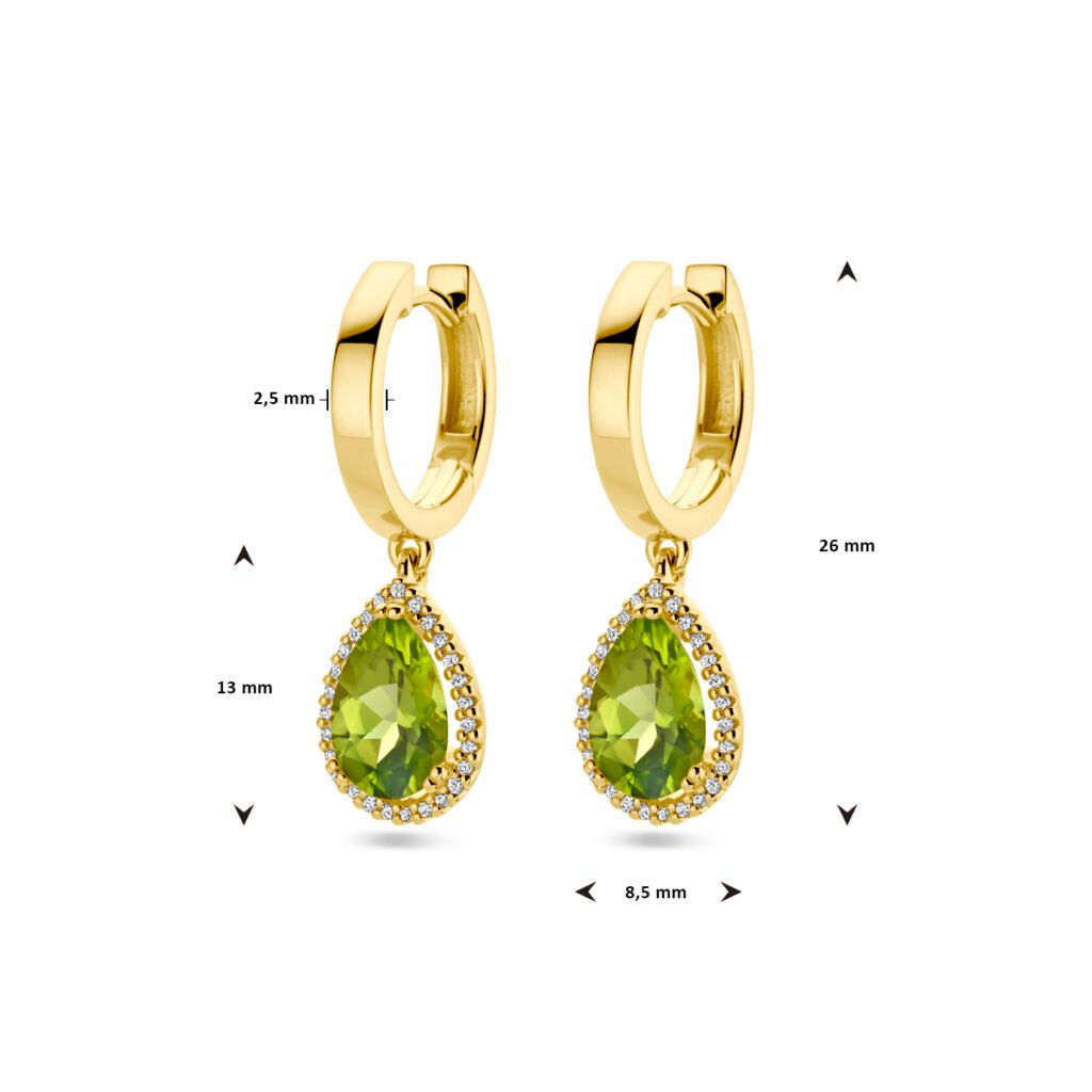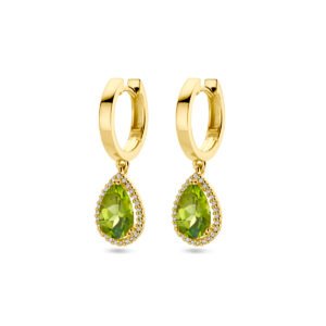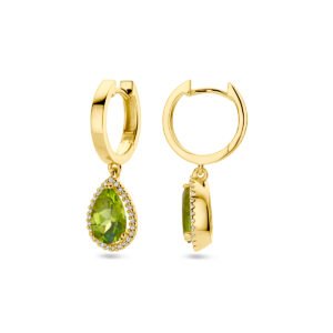 14k Geelgouden klapoorringen uitgevoerd met schitterende peridot en een diamant rij. De klapoorringen hebben een totale hoogte van 26mm.