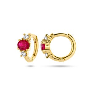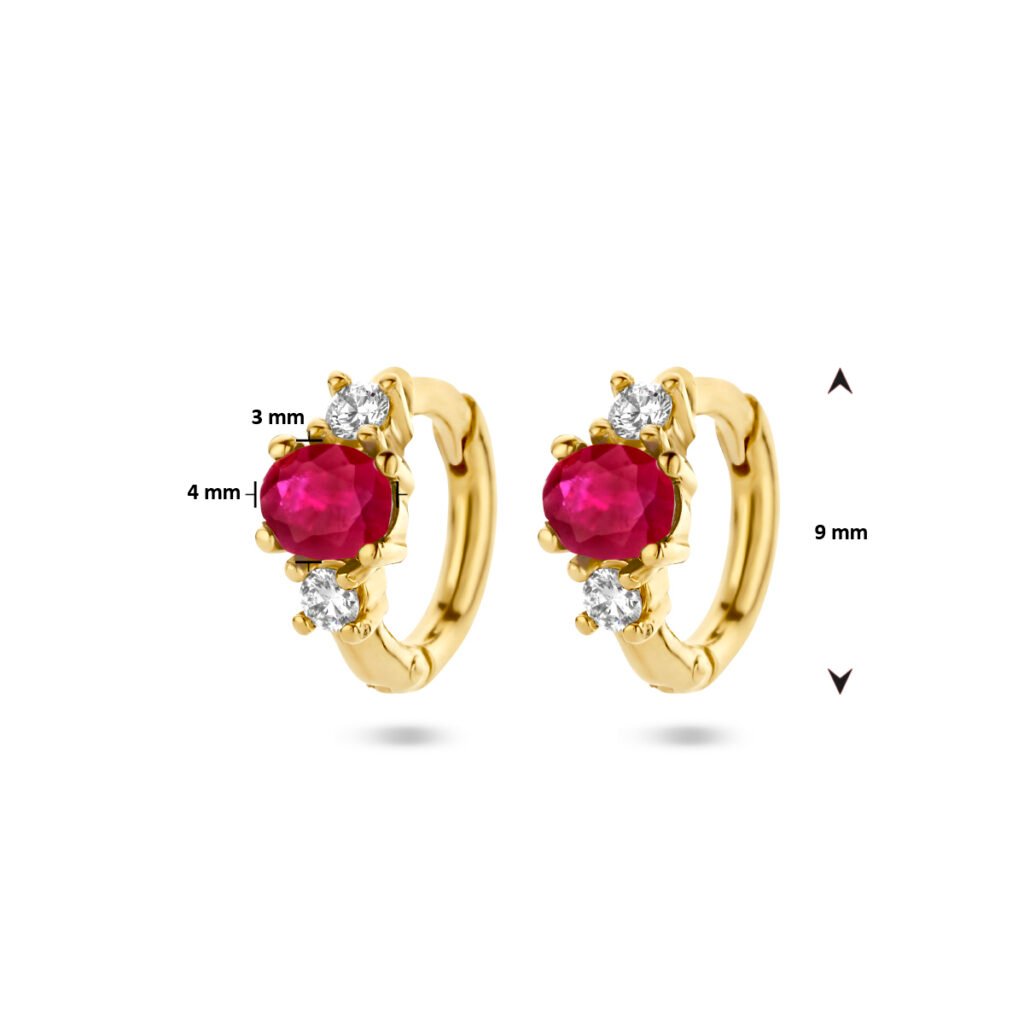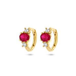 Deze elegante Gouden Klapoorringen met Diamanten en Robijn zijn vervaardigd uit 14 karaat goud en zijn voorzien van 2 Diamanten en 1 Robijn. De Gouden Klapoorringen met Diamanten en Robijn hebben een diameter van 9 mm, waarbij de stenen een afmeting hebben van 4 x 3 mm.