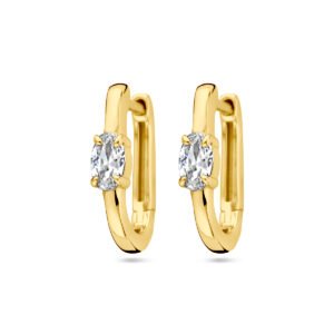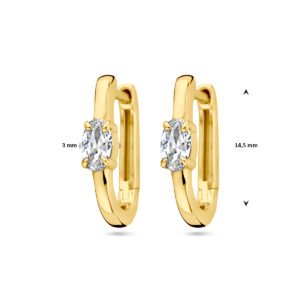 Geelgoud op 925 zilveren klapoorringen uitgevoerd met zirkonia. De klapoorringen hebben een afmeting van 14.5x3mm. Geen garantie op de plating.