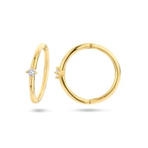 Deze gracieuze Gouden Klapoorringen met Zirkonia zijn vervaardigd uit gepolijst 14 karaat goud en zijn voorzien van een chaton gezette, briljant geslepen, transparante Zirkonia met een diameter van 1,5 mm. De oorbellen hebben een metaalgewicht van circa 0,79 gram, een diameter van 12 mm bij een breedte van 2,2 mm.