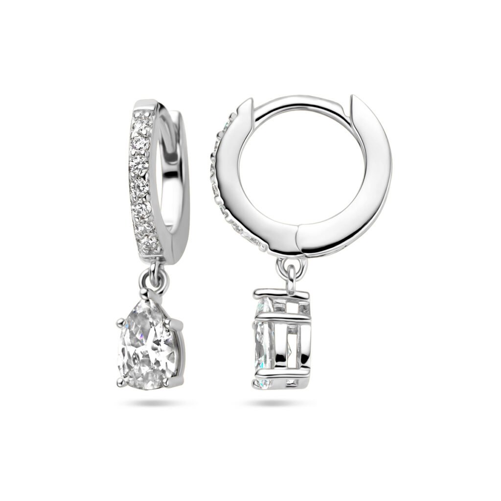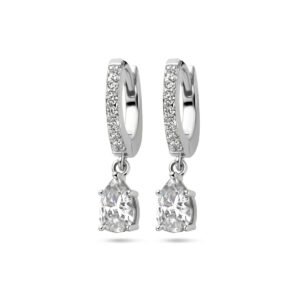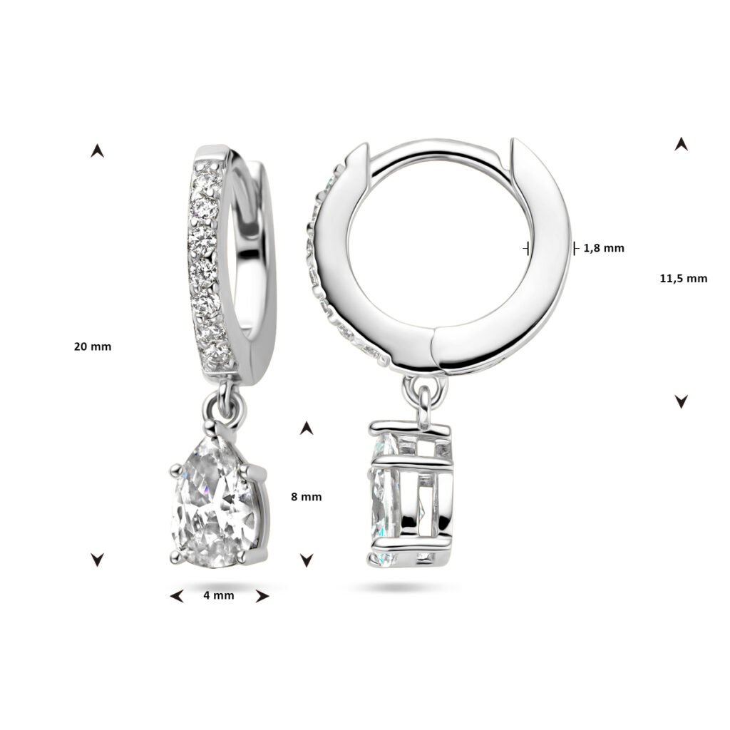 Gerhodineerd 925 zilveren klapoorringen uitgevoerd met zirkonia. De oorringen hebben een totale hoogte van 20mm.