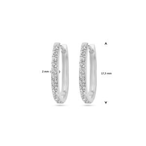 Deze stijlvolle Zilveren Klap Oorringen met Zirkonia’s zijn vervaardigd uit 925 Sterling zilver, dat is voorzien van een Rhodium coating. De ovale creolen zijn aan de voorzijde voorzien van in rijzetting geplaatste, briljant geslepen, transparante Zirkonia steentjes. Deze oorbellen hebben een metaalgewicht van circa 1,98 gram, bij een hoogte van 17,5 mm en een breedte van 2 mm.