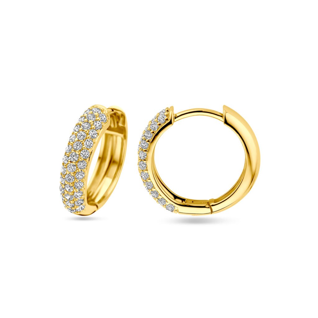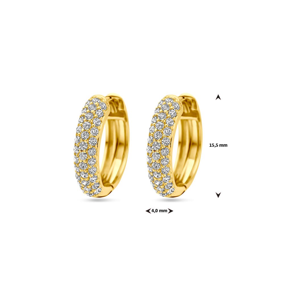 Geelgoud op 925 zilveren klapoorringen uitgevoerd met zirkonia. De klapoorringen hebben een afmeting van 15.5x4mm. Geen garantie op de plating.