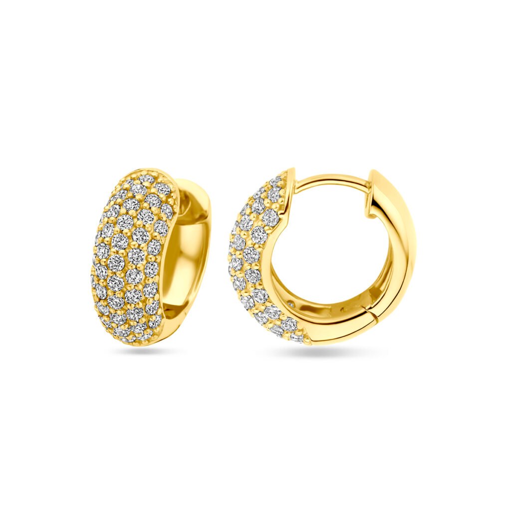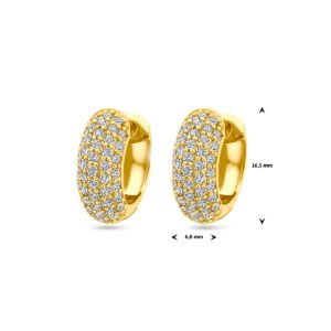 Geelgoud op 925 zilveren klapoorringen uitgevoerd met zirkonia. De klapoorringen hebben een afmeting van 16.5x6mm. Geen garantie op de plating.