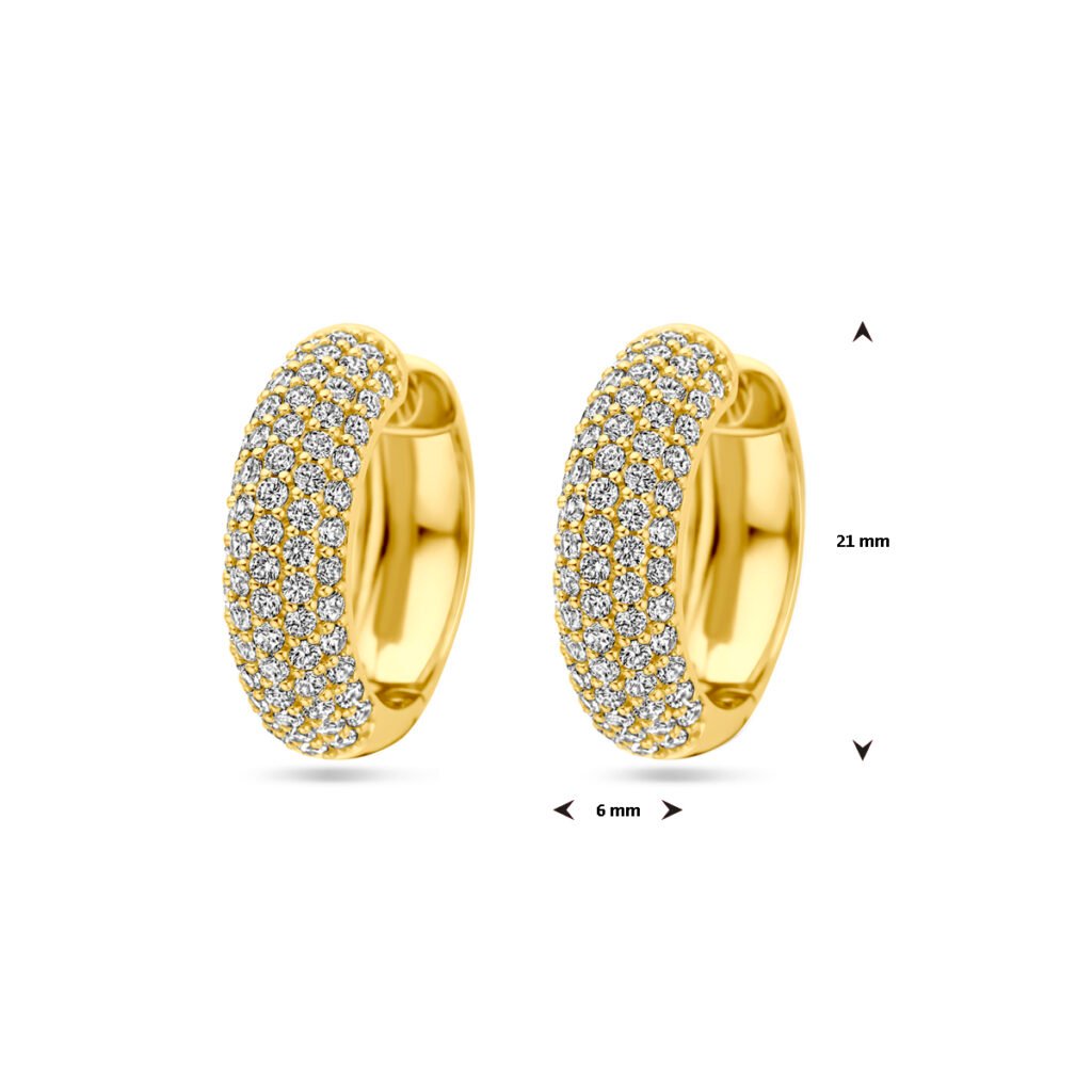 Geelgoud op 925 zilveren klapoorringen uitgevoerd met zirkonia. De klapoorringen hebben een afmeting van 21x6mm. Geen garantie op de plating.