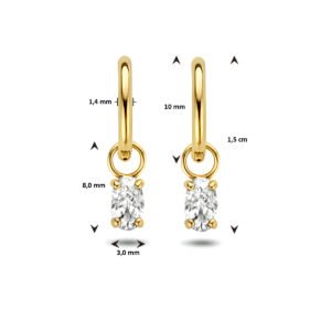14k Geelgouden klapoorringen uitgevoerd met een hanger met daarin een heldere zirkonia. De klapoorringen hebben een diameter van 10mm en een dikte van 1.4mm. De hanger heeft een afmeting van 8x3mm.