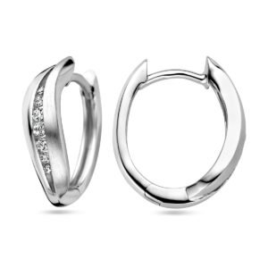 Gerhodineerd 925 zilveren klapoorringen uitgevoerd met zirkonia. De klapoorringen hebben een afmeting van 16×5.5mm.