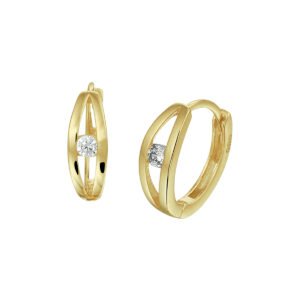 Geelgouden klapoorringen met een afmeting van 13x4mm uitgevoerd met een ingespannen briljant geslepen zirkonia. De klapoorringen zijn ook verkrijgbaar in het witgoud.