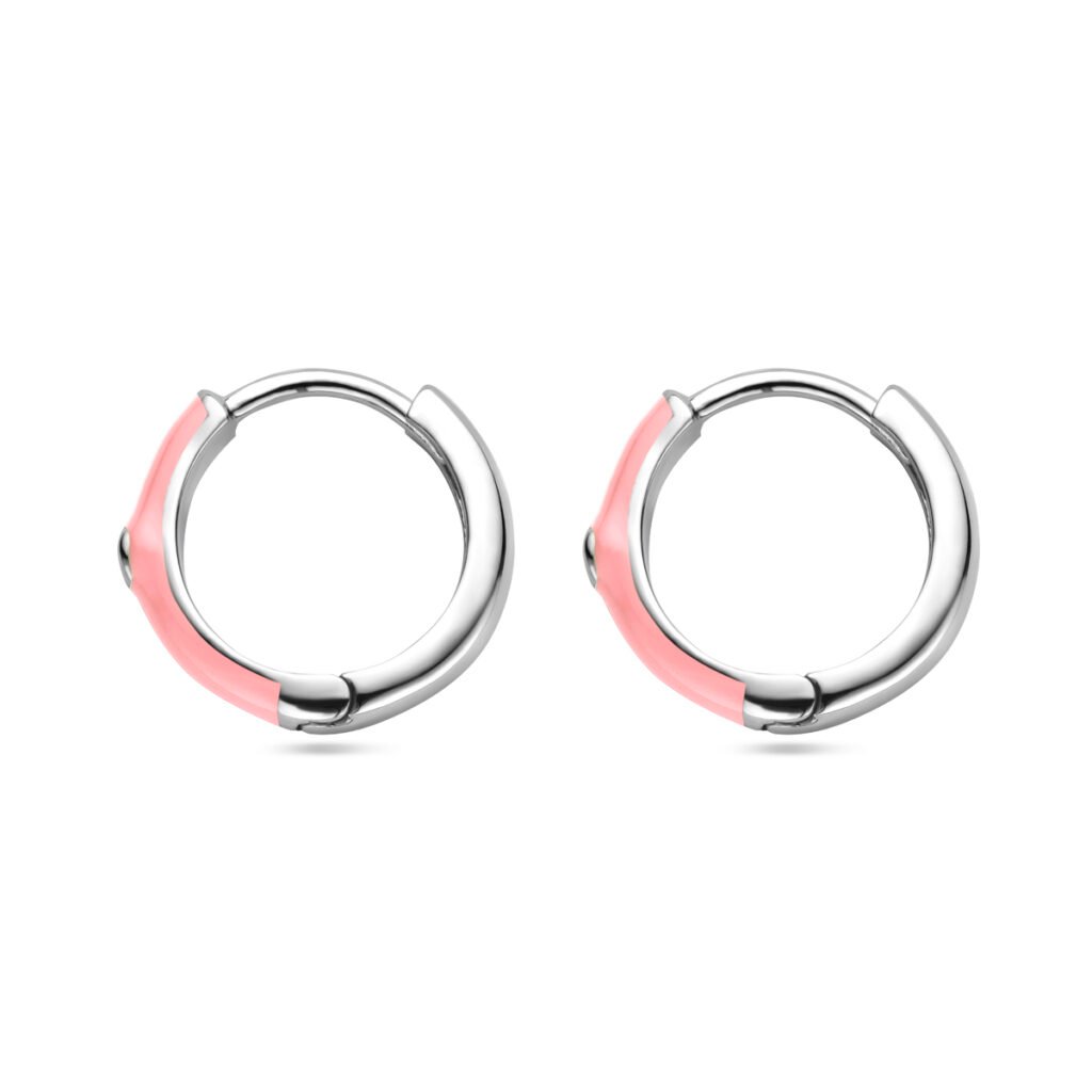 Gerhodineerd 925 zilveren klapoorringen uitgevoerd met zirkonia en roze emaille. De klapoorringen hebben een afmeting van 15×2.5mm.