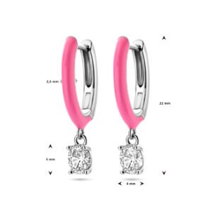 Gerhodineerd 925 zilveren klapoorringen uitgevoerd met zirkonia en roze emaille. De klapoorringen hebben een totale hoogte van 22mm.