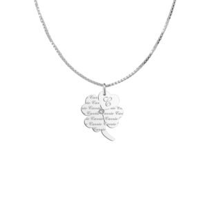 De door u opgegeven naam wordt herhaaldelijk gegraveerd op deze stijlvolle zilveren klaver 4 naamhanger, gezien bij Carrie Bradshaw in Sex and the City 2. De eerste letter van uw opgegeven naam wordt groot gegraveerd in één van de klaver 4 blaadjes. De hanger heeft een grootte van 26×22 mm.