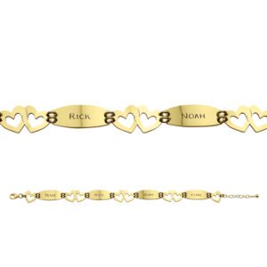 Deze gouden armband met graveerplaatjes en opengewerkte hartjes van Names4ever is gemaakt van 14 karaats goud, de allerbeste kwaliteit goud, en bestaat uit meerdere rechthoekige plaatjes die van elkaar worden gescheiden door middel van twee aan elkaar verbonden opengewerkte hartjes. De vier graveerplaatjes kunnen voorzien worden van in totaal vier gegraveerde namen zodat u verzekerd bent van een persoonlijk en uniek sieraad. Aan de achterkant zit een handige karabijnsluiting, waardoor u deze armband gemakkelijk om- en afdoet, met een kort verlengstukje. Deze armband heeft een maximale lengte van 20cm met een minimale draaglengte van 17cm. De graveerplaatjes hebben een afmeting van 21x10mm met een dikte van 0,4mm.