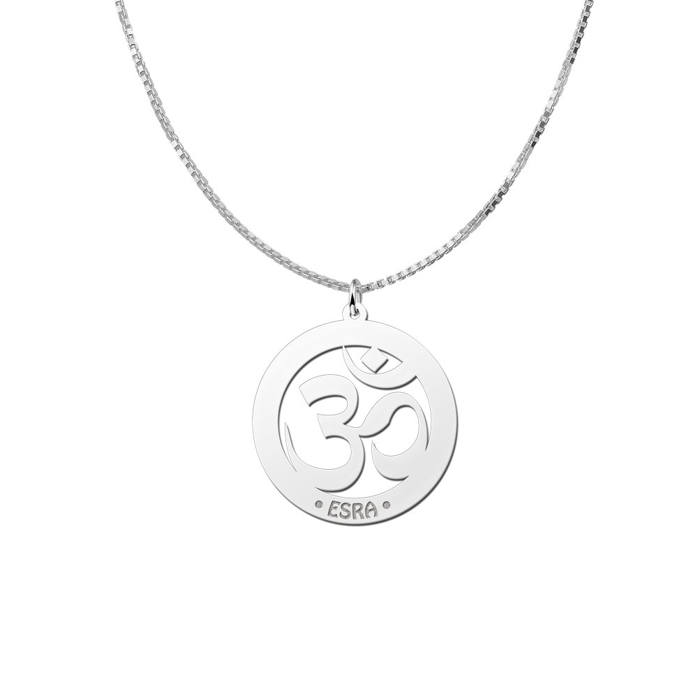 Deze ohm naamhanger is gemaakt van 925 sterling zilver en heeft een diameter van 30 mm. De hanger bestaat uit een omlijstende cirkel met daarin het ohm symbool. Onder in de omlijstende cirkel is er ruimte voor één door u doorgegeven gegraveerde naam met aan weerszijden twee rondjes.