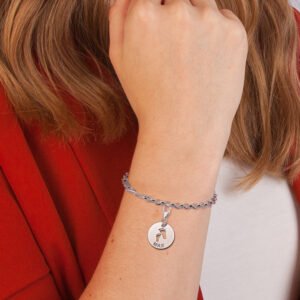 Deze ronde charm-naambedel met baby voetjes heeft een diameter van 14 mm en is gemaakt van 925 sterling zilver. De charm-naambedel bestaat uit een rond, zilveren plaatje met daarin twee uitgespaarde voetjes en daaronder ruimte voor één door u opgegeven gegraveerde naam. Deze charm-naambedel is bijzonder leuk als cadeau voor de moeder van de pasgeborene en zal zeker in de smaak vallen.