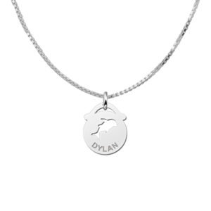 Deze ronde naamhanger met dolfijn is gemaakt van 925 sterling zilver en heeft een totale grootte van 15×17 mm. De naamhanger bestaat uit een rond plaatje met daarop de door u opgegeven gegraveerde naam met daarboven een uitgespaarde dolfijn.