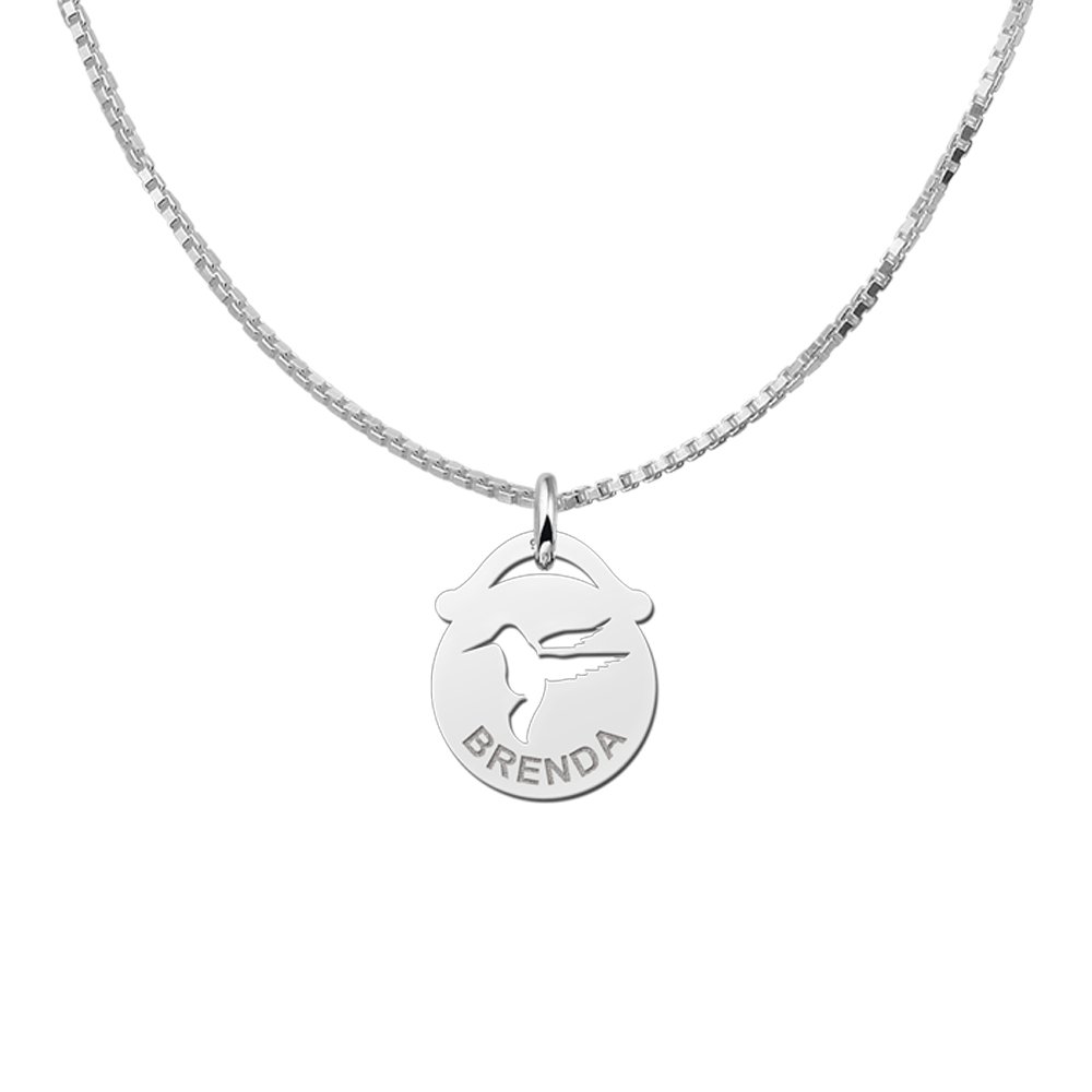 Deze ronde naamhanger met vogel is gemaakt van 925 sterling zilver en heeft een totale grootte van 15×17 mm. De naamhanger bestaat uit een rond plaatje met daarop de door u opgegeven gegraveerde naam met daarboven een uitgespaarde vogel.