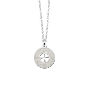 Deze zilveren graveerhanger met opengewerkt klavertjevier van Names4ever is gemaakt van 925 sterling zilver, de allerbeste kwaliteit zilver, en bestaat uit een slank oogje waar u gemakkelijk een ketting naar keuze doorheen haalt, met daaronder een ronde hanger met een gediamanteerd oppervlak met in het midden een opengewerkt klavertjevier. Boven en onder het klavertjevier is er ruimte voor twee gegraveerde regels tekst van maximaal 18 tekens per stuk. Zo kunt u deze hanger al snel voorzien van in totaal maar liefst 36 tekens. Deze hanger heeft een afmeting van 17x17mm met een dikte van 0,7mm.