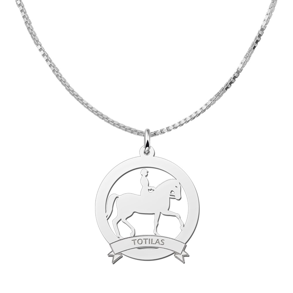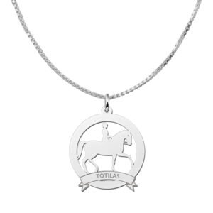 Deze ruiter in rand naamhanger is gemaakt van 925 sterling zilver en heeft een diameter van 25 mm. Deze hanger bestaat uit een ronde omlijsting met daarin een paard met ruiter. Onder de paard met ruiter zit een lint waarop de door u opgegeven naam gegraveerd wordt.