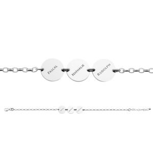 Deze zilveren armband met drie rondjes van Names4ever is gemaakt van 925 sterling zilver, de allerbeste kwaliteit zilver, en bestaat uit meerdere slanke schakels die mooi op elkaar aansluiten, met aan de voorkant drie ovaaltjes. Deze drie rondjes kunnen voorzien worden van drie namen naar keuze, die diagonaal over het plaatje geplaatst worden, zodat u verzekerd bent van een persoonlijk en uniek sieraad. Aan de achterkant zit een handige karabijnsluiting, waardoor u deze armband gemakkelijk om- en afdoet. Deze armband heeft een maximale lengte van 20cm met een minimale draaglengte van 17cm. De hartvormige plaatjes hebben een afmeting van 12x12mm met een dikte van 0,7mm.