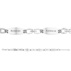 Deze zilveren naamarmband met opengewerkte plaatjes van Names4ever is gemaakt van 925 sterling zilver, de allerbeste kwaliteit zilver, en bestaat uit meerdere langwerpige plaatjes die worden afgewisseld met opengewerkte plaatjes ter decoratie. De graveerplaatjes kunnen alle vier voorzien worden van een naam naar keuze, zodat u verzekerd bent van een persoonlijk en uniek sieraad. Aan de achterkant zit een handige karabijnsluiting, waardoor u deze armband gemakkelijk om- en afdoet, met een kort verlengstukje. Deze armband heeft een maximale lengte van 20cm met een minimale draaglengte van 17cm. De graveerplaatjes hebben een afmeting van 22x10mm met een dikte van 0,7mm.