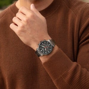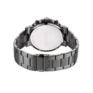 Dit unieke Olympic horloge met artikelnummer: OL89HGG002 is een heren horloge met een stoere uitstraling. De stalen kast heeft een gladde bezel en een grijze wijzerplaat met een chronograaf. De uursaanduiding is opvallend door de lumibrite en rode strepen en wijzers. Dit geeft het horloge een stoer uiterlijk. Aan de stalen kast zit een gunmetal stalen schakelband met een vouwsluiting. Het horloge heeft een mineraalglas, een doorsnee van 44mm en is 5ATM.