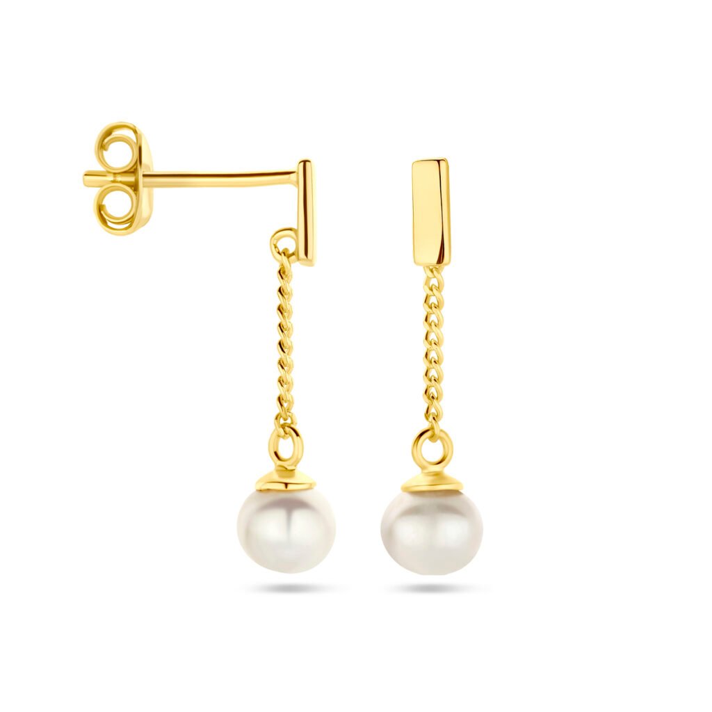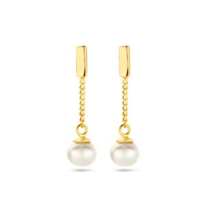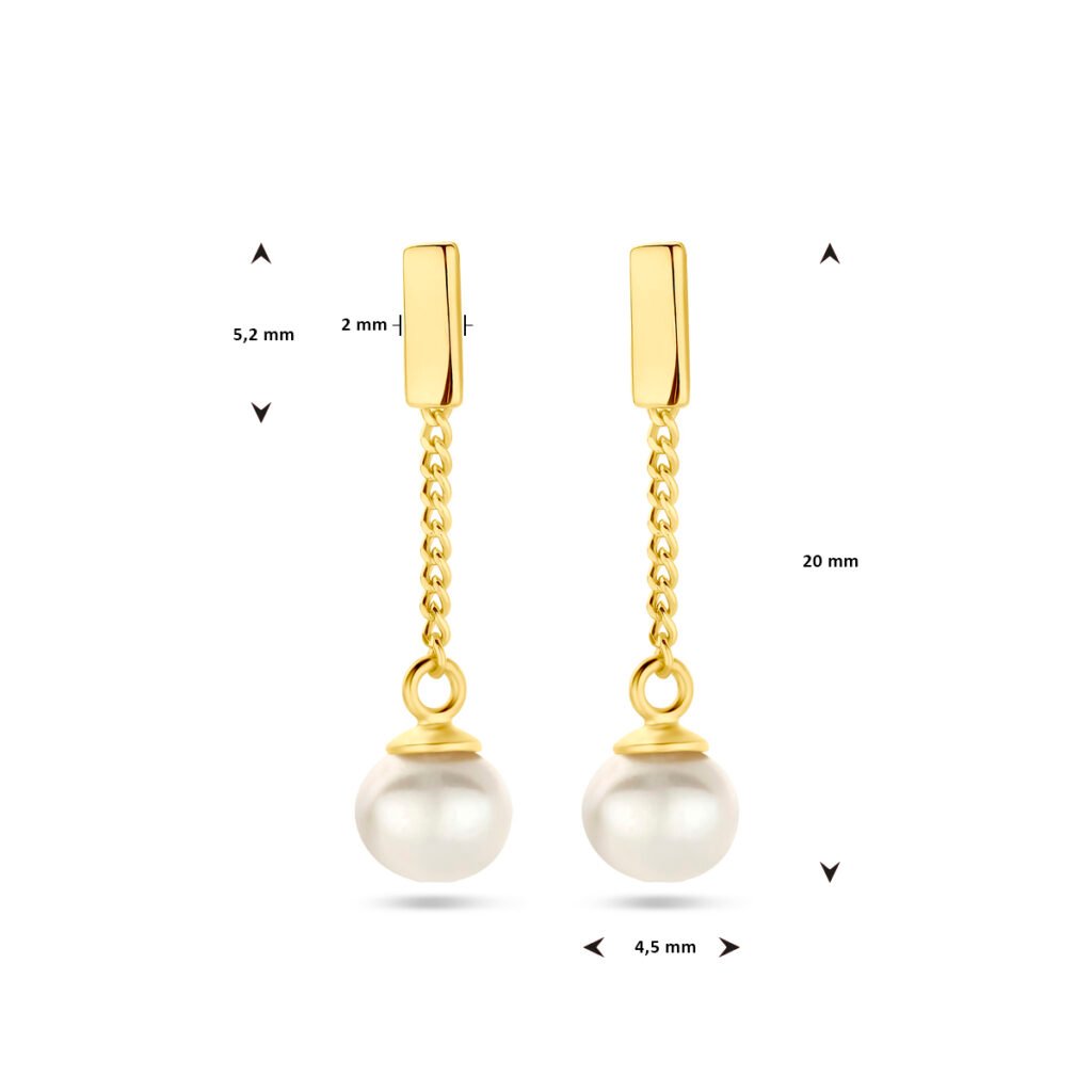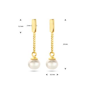 Geelgoud op 925 zilveren oorhangers uitgevoerd met een zoetwaterparel. De oorhangers hebben een totale hoogte van 2cm. Het balkje heeft een afmeting van 5.2x2mm. Geen garantie op plating.