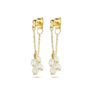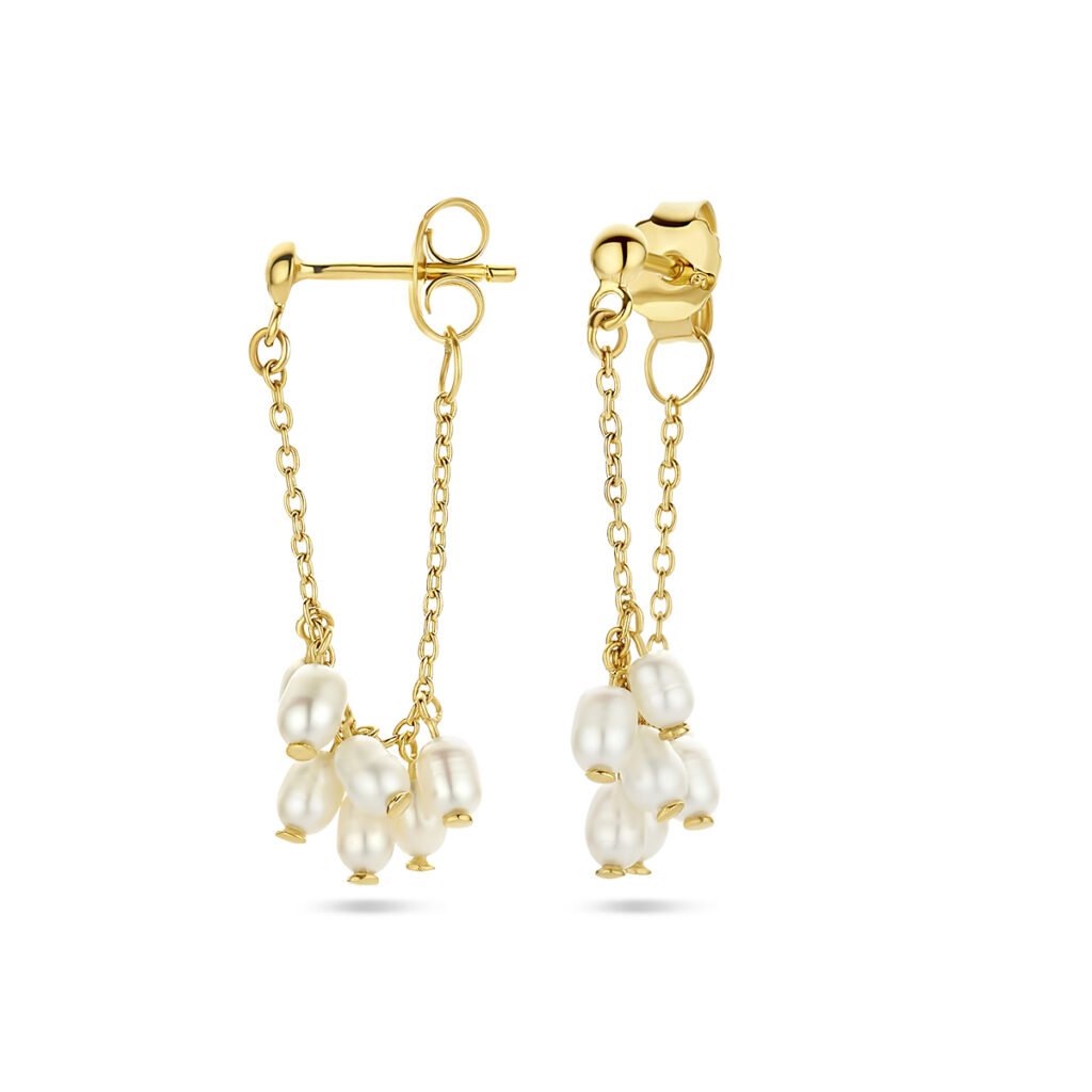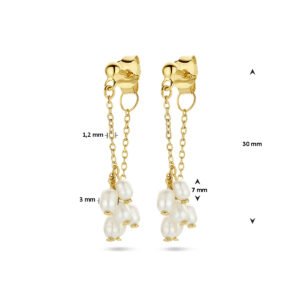 Deze Goudkleurige Oorhangers Parels zijn vervaardigd uit 925 Sterling zilver dat is voorzien van een goudkleurige coating. De oorhangers hebben een metaalgewicht van circa 1,82 gram en bevat een plating van 1 micron. Deze oorhangers bestaan uit een oorsteker met daaraan een goudkleurig kettinkje met een breedte van 1,2 mm met daaraan in het midden, elk aan een opeenvolgend schakeltje bevestigd, 6 witte zoetwater Parels met een breedte van 3 mm en een lengte van 7 mm. Het kettinkje is aan de achterkant bevestigd aan de goudkleurige vlindersluiting. De oorhangers hebben een lengte van 30 mm. Deze oorhangers zijn te combineren met 21.03307 Goudkleurige Collier met Parels en met 21.03303 Goudkleurige Collier Parels.