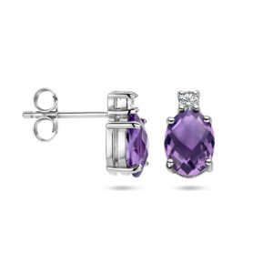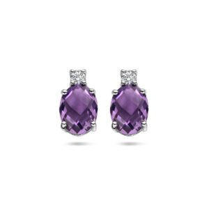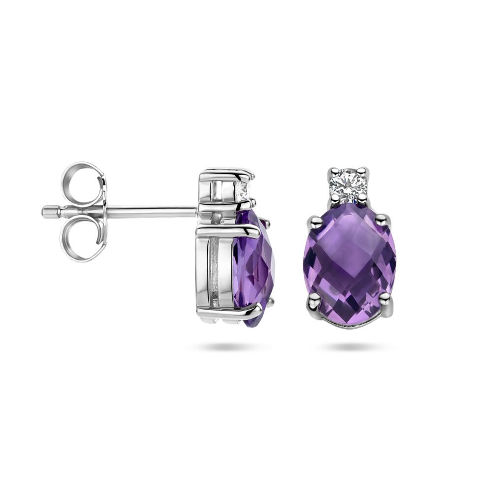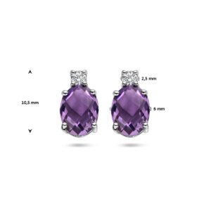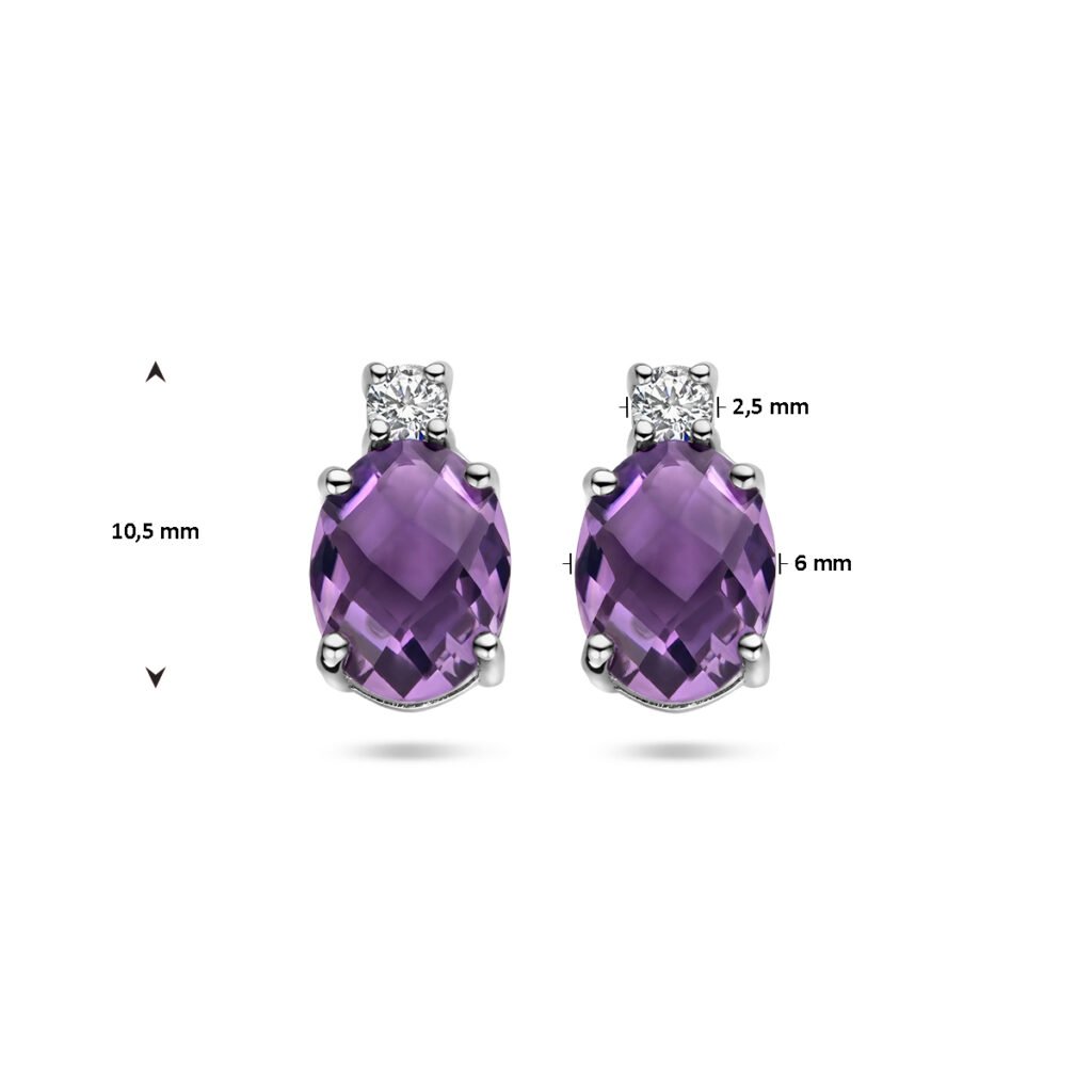 Gerhodineerd 925 zilveren oorknoppen uitgevoerd met amethist en zirkonia. De oorknoppen hebben een totale hoogte van 10.5mm.