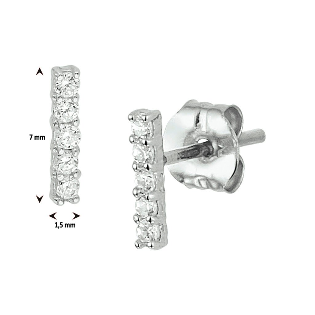 Een goede garderobe begint bij de basis en hetzelfde geldt voor een tijdloze sieradencollectie! Witgouden oorknoppen in de vorm van een balkje uitgevoerd met een rij van heldere zirkonia. De oorknoppen hebben een afmeting van 7×1,5mm.