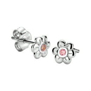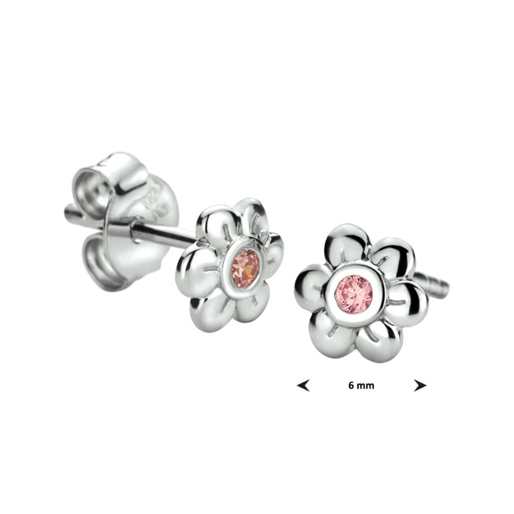 Gerhodineerd 925 zilveren oorknoppen in de vorm van een bloem met een schitterende roze zirkonia. De oorknoppen hebben een breedte van 6mm.