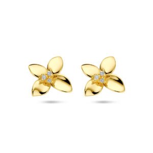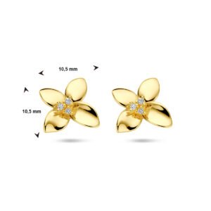 14k Geelgouden oorknoppen uitgevoerd met een bloem en zirkonia. De oorknoppen heeft een afmeting van 10.5×10.5mm.