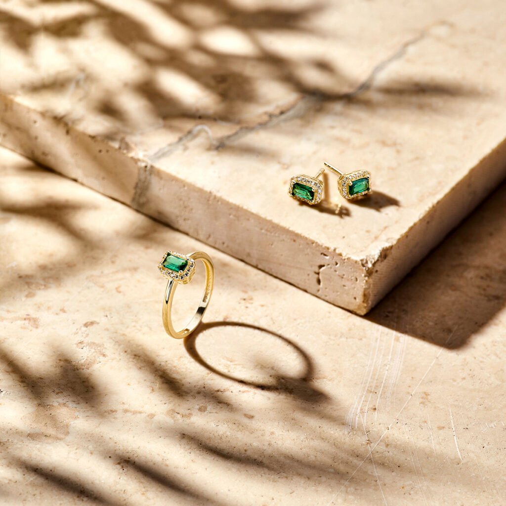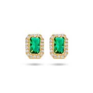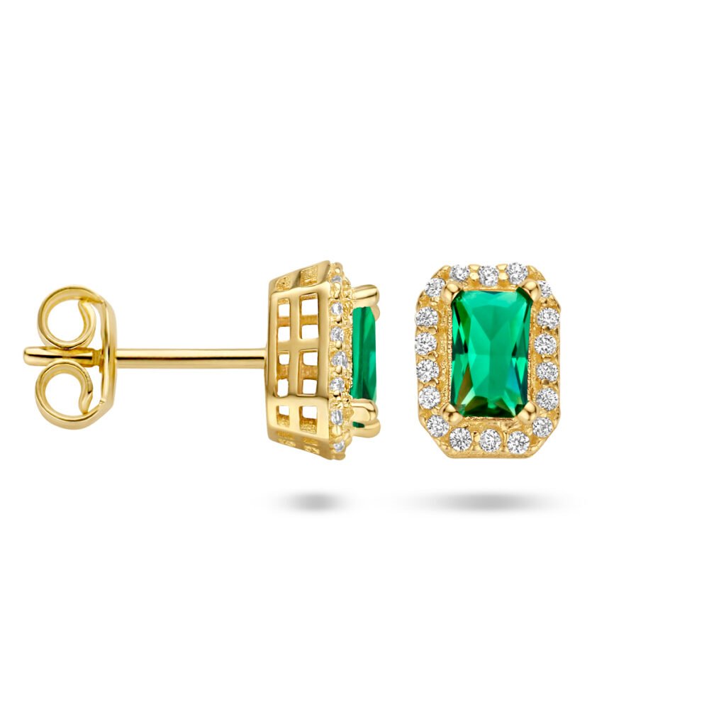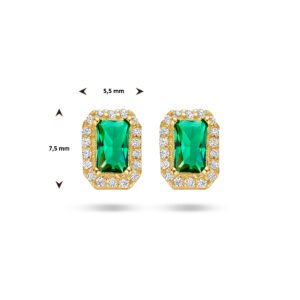 Exclusieve rechthoekige Gouden Oorstekers met Groene Zirkonia en Zirkonia Halo, die zijn vervaardigd uit 14 karaat geelgoud en zijn voorzien van 1 rechthoekige groene zirkonia waar een halo van transparante zirkonia’s omheen geplaatst is. Deze exclusieve Gouden Oorstekers met Groene Zirkonia en Zirkonia Halo hebben een knop met een totale afmeting van 7,5 x 5,5 mm.