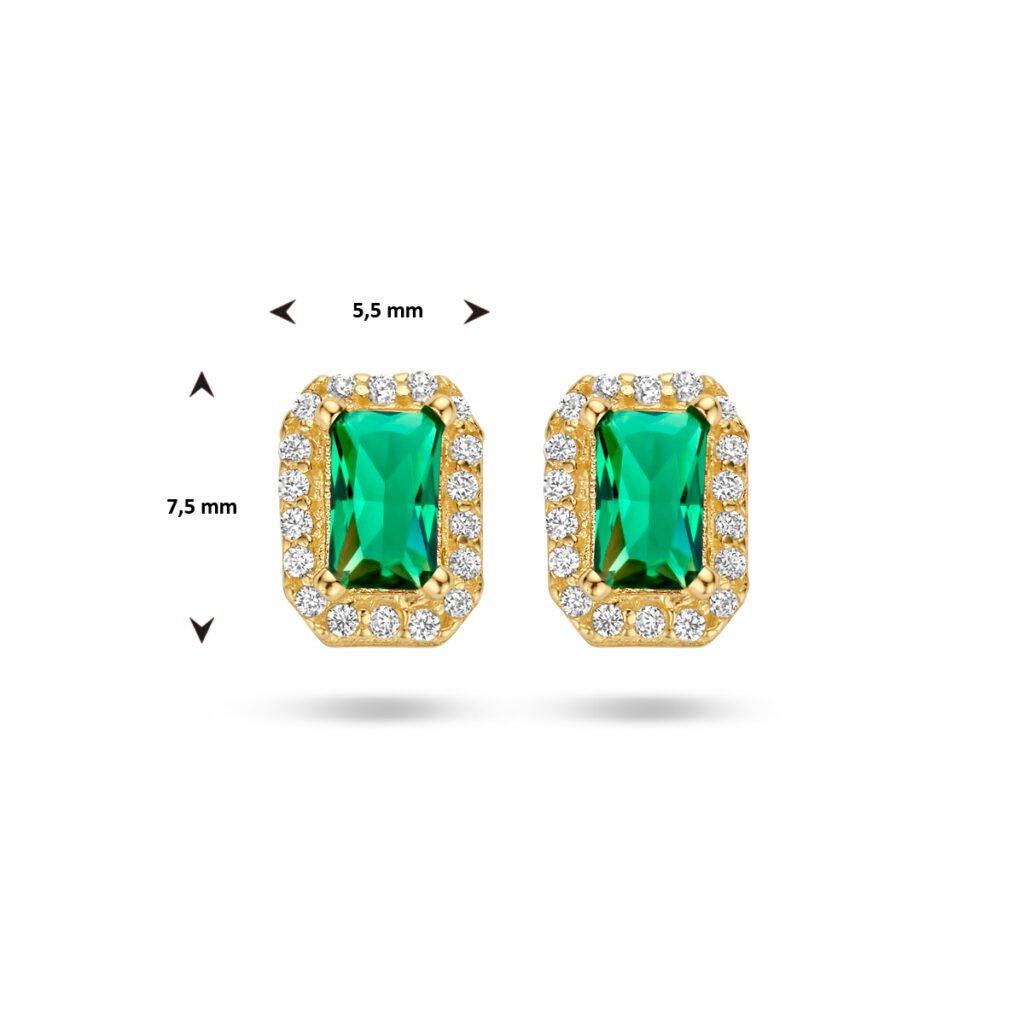 14k Geelgouden oorknoppen uitgevoerd met schitterende groene zirkonia. De oorknoppen hebben een afmeting van maat 7.5×5.5mm.