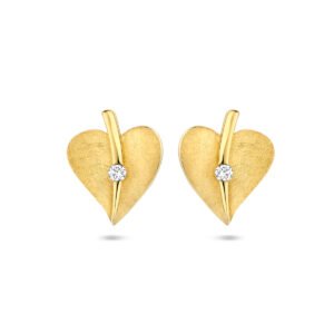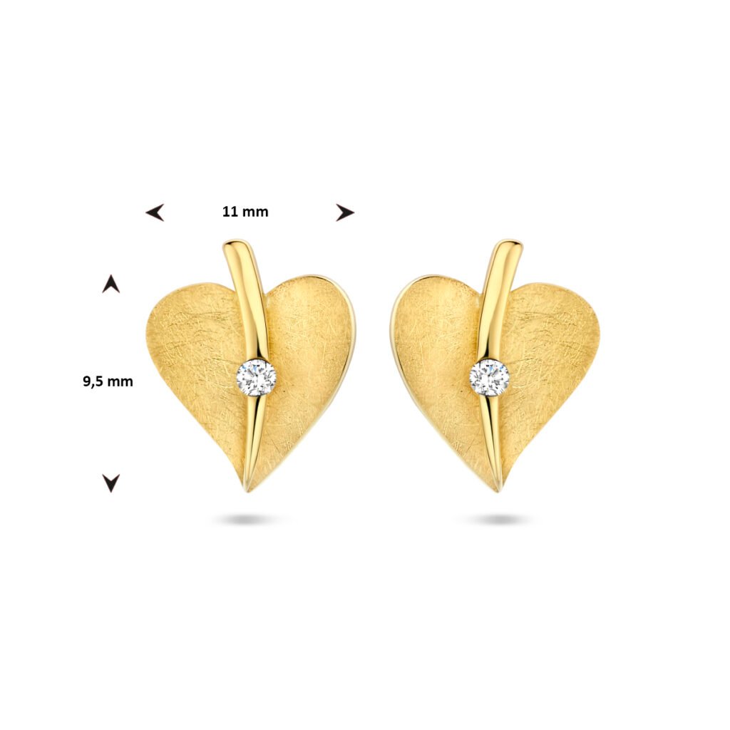 14k Geelgouden oorknoppen uitgevoerd in vorm van een hart en een schitterende diamant. De oorknoppen hebben een afmeting 11×9.5mm.