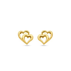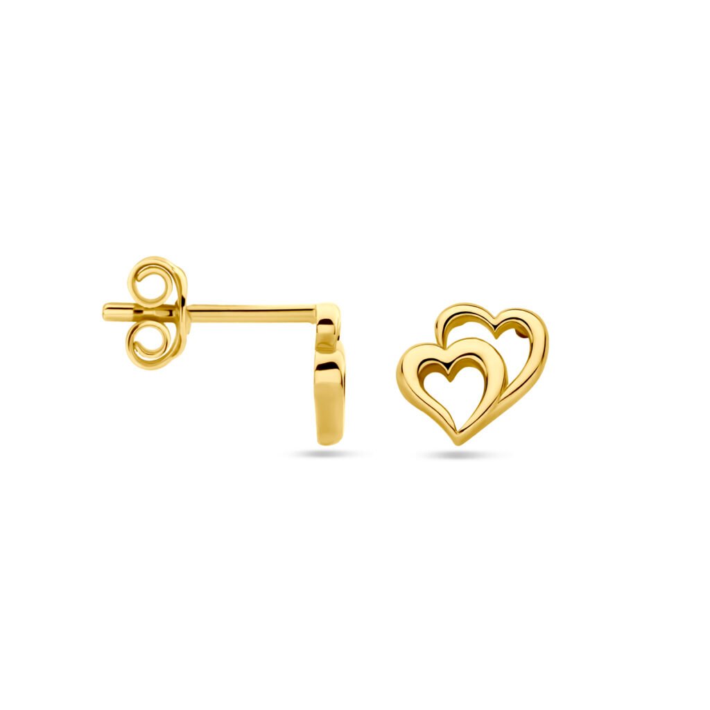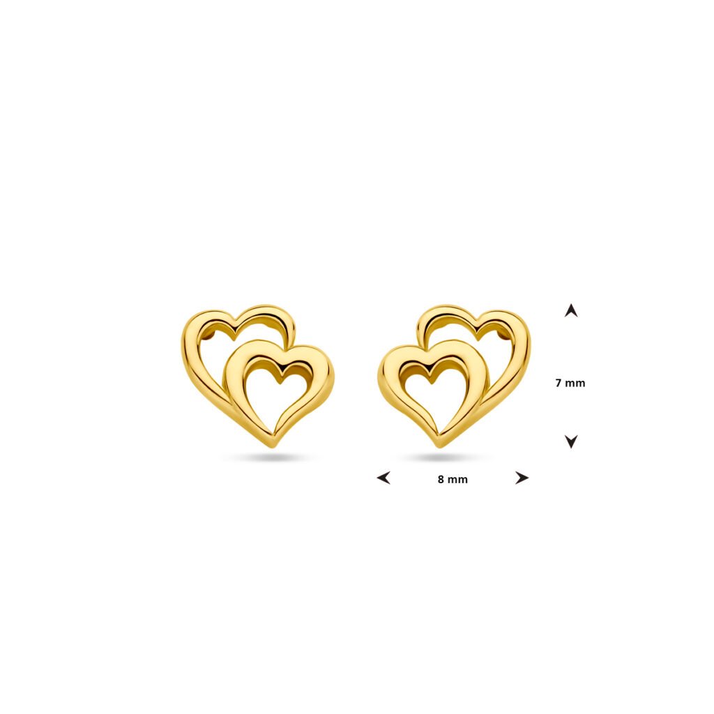 14k Geelgouden oorknoppen uitgevoerd met hartjes. De oorknoppen hebben een afmeting van 7x8mm.