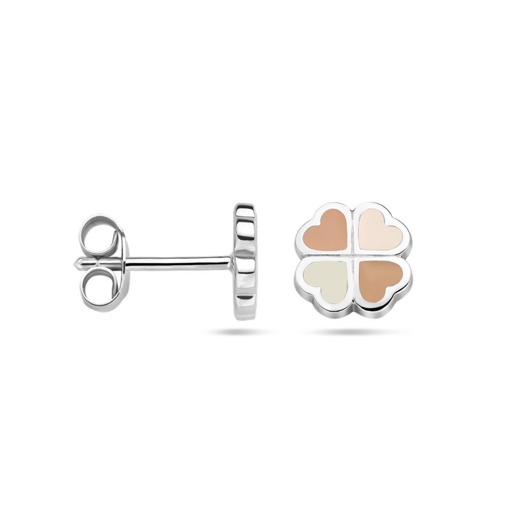 Gerhodineerd 925 zilveren oorknoppen in de vorm van een klavertje met roze en wit parelmoer. De oorknoppen hebben een afmeting van 7.5×7.5mm.