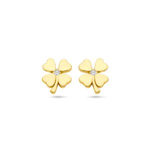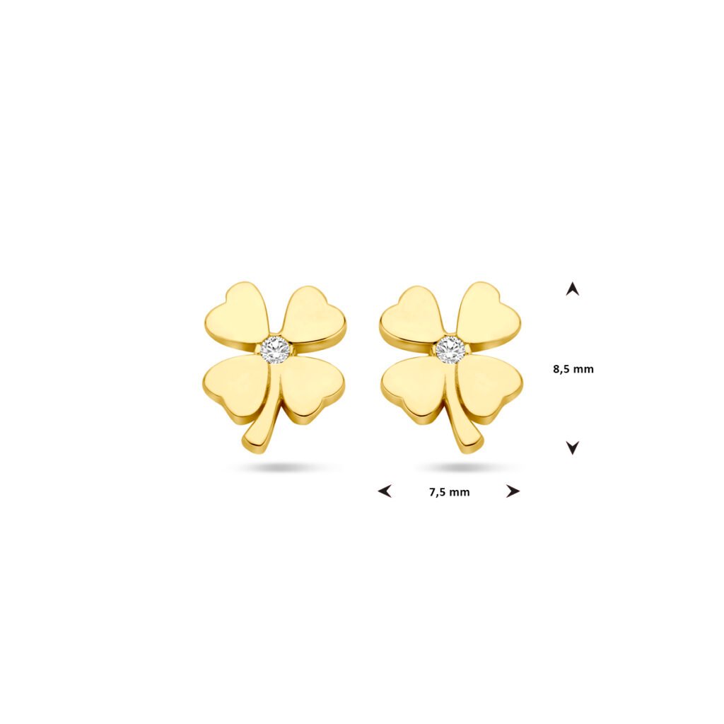 14k Geelgouden oorknoppen uitgevoerd met een klavertje en zirkonia. De oorknoppen hebben een afmeting van 8.5×7.5mm.