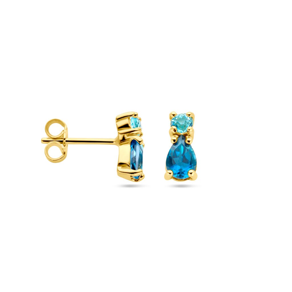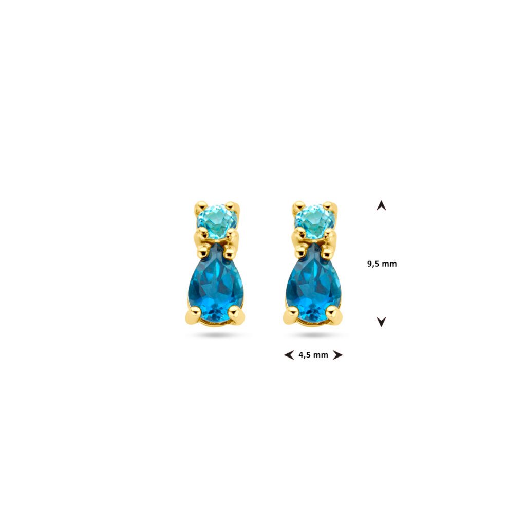 14k Geelgouden oorknoppen uitgevoerd met london blue topaas en sky blue topaas. De oorknoppen hebben een afmeting van 9,5×4,5mm.