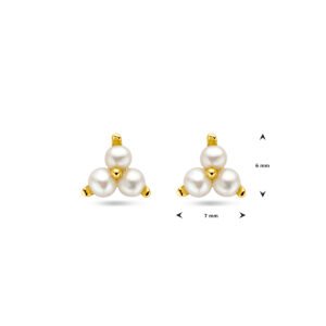 Deze koninklijke Goudkleurige Oorknoppen met Parels 6 x 7 mm zijn vervaardigd uit 925 Sterling zilver, dat is voorzien van een goudkleurige coating van 1 micron. De oorknoppen bevatten 3 witte, in chatonzetting geplaatste Zoetwaterparels met een diameter van 3 mm. De oorknoppen hebben een breedte van 7 mm bij een hoogte van 6 mm en een metaalgewicht van 0,65 gram. De oorstekers worden gesloten met behulp van een vlindersluiting van 925 Sterling zilver, dat is voorzien van een goudkleurige coating.